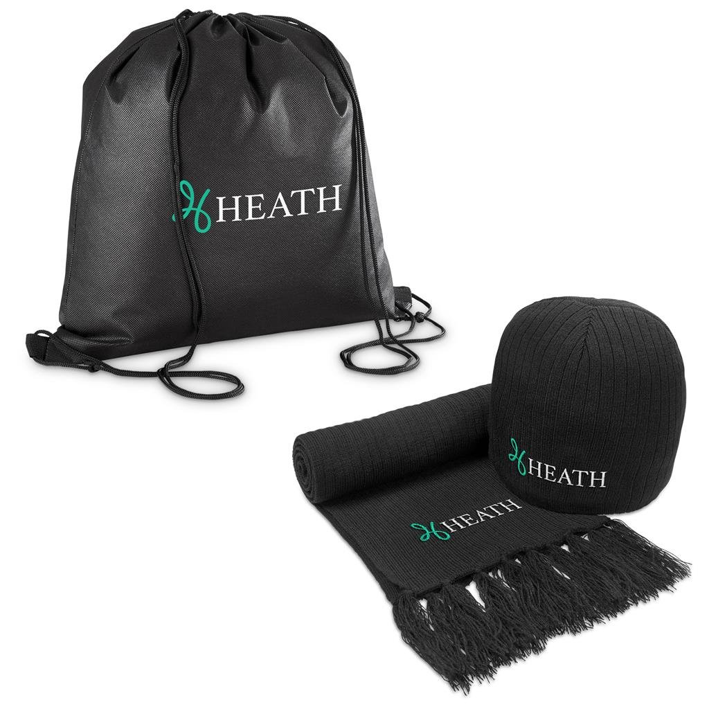 Stay warm this Winter, or in the outdoors, with this cosy scarf and beanie, packaged together in a drawstring bag.